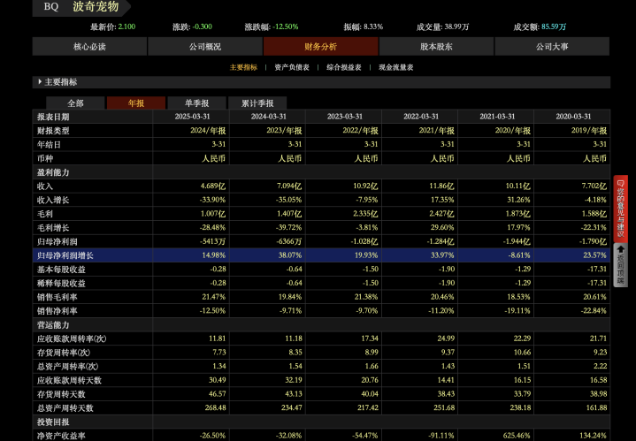 据了解,波奇宠物(BQ.US)是国内“宠物电商第一股”,于2020年登陆美股,上市以来长期面临亏损态势,市值持续缩水。东方财富数据显示,波奇宠物2020财年-2024财年皆处于亏损态势,2024财年实现收入4.69亿元,同比下滑33.9%,同期归母净利润为-5413万元,销售净利率为-12.50%。截至12月12日收盘,波奇宠物总市值仅为1025万美元。